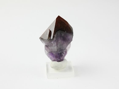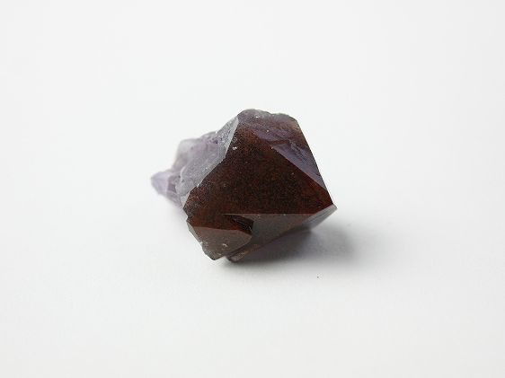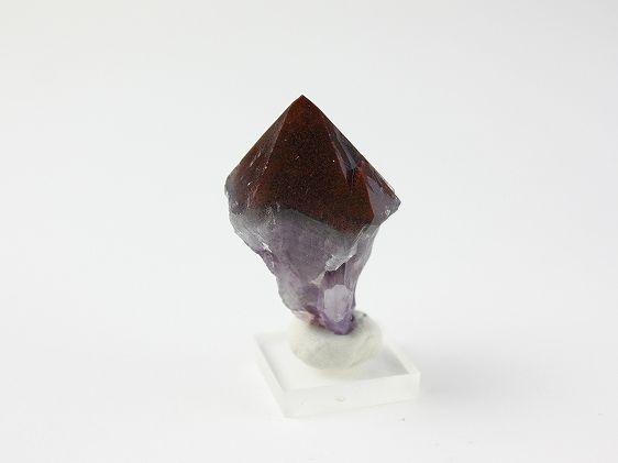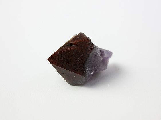 直径30mmの結晶ですが側面に小さな結晶が付いています。根元の部分が紫色から白色、黒色、赤色へと変化があります。赤い先端部は光にかざすと透明で下部は黒色の二層になっています。先端部の表面は濃い赤黒色で赤茶色の細かな斑点に覆われています。