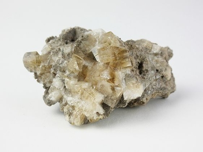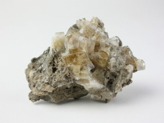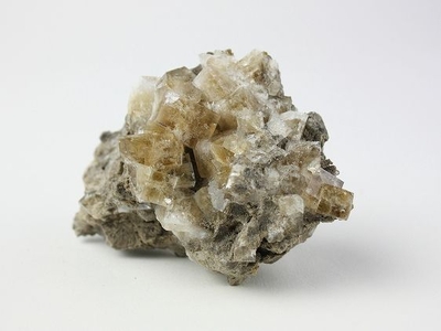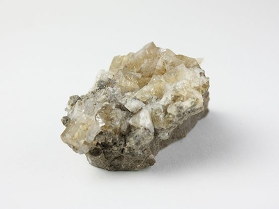 浅海のサンゴなどが堆積した石灰岩が、ドロマイト化作用*を受けた苦灰岩の蛍石です。 結晶のウイスキー色は炭化水素の包有物で、表面に近い部分は無色透明です。