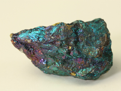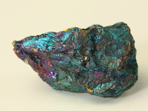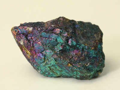 斑銅鉱は銅鉱床の酸化帯に二次鉱物として産出します。輝銅鉱、黄銅鉱、四面銅鉱と共生をしている場合があり、これらの鉱物と固溶体であることがわかります。新鮮な面は淡いブロンズ色ですが、時間が経つとともに紫がかった藍色になります。これは含まれている鉄と銅が酸化して変色するためです。