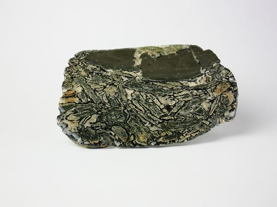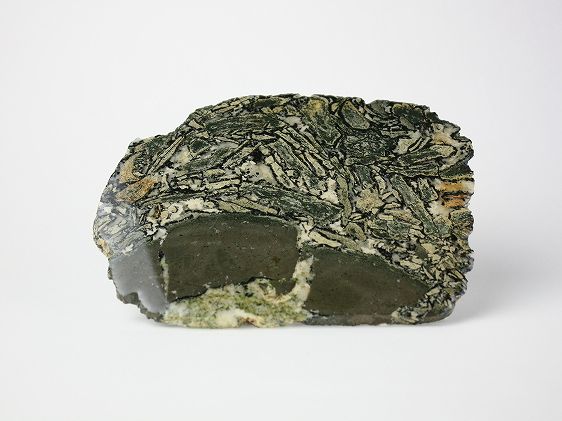 枕状玄武岩が熱水変質を受け、石英、緑泥石、緑簾石、パンペリー石などの鉱物の組み合わせになっています。